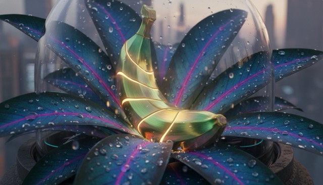 Nano Banana is a specialized AI image generator trained on high-end digital art and professional photography. It is known for its high-tech tropical aesthetic, vibrant colors, and precision rendering of miniature and organic textures.